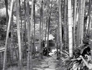 等々力不動尊の反対側、遊歩道の右手が日本庭園だ。遊歩道に庭園入口の案内表記がある。入口は2ヶ所あり、先に正門入口の案内があるが、そこからさらに60メートルほど先の「冠木門入口」の方が風情がある。日本庭園の雰囲気を味わうなら、この冠木門からのアプローチがおすすめ。門を入って右側の園路は両側が竹林になっている。