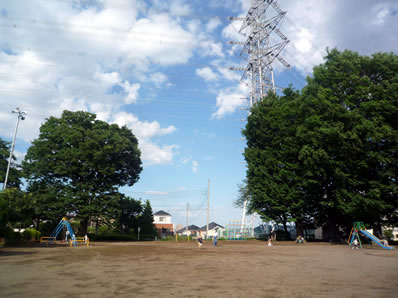 広場の周囲にはケヤキなどの木々が高く伸びていて、緑豊かでなかなか気持ちのいい広場だ。辺りには高い建物もなく、初夏の日差しに照らされた緑がよく映えている。公園の南東側は視界が開けていて、浅川対岸に連なる多摩丘陵の緑も目に入ってくる。また、この公園は辺りから少し高い場所に造られていて、風の通りも幾分いいように感じられた。なお、この公園は地域の避難場所にもなっている。広々とした運動広場では、子どもたちが気持ちよさそうに走り回っていた。