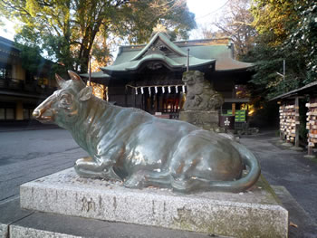 二の鳥居をくぐり階段を下ると、拝殿の入口手前には牛の像「座牛」があった。菅原道真は牛と縁が深かったと言われており、これは道真が死去した時の悲しみで動けなくなってしまった牛を表現したものであるという。そう言われてみると、この伏した牛の目は、どこかうつろであるように感じられる。なお、この「座牛」は拝殿手前にも1体あり、こちらは角が生えたリアルな造りの像となっていた。