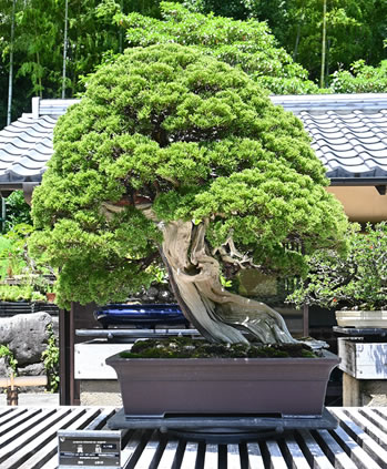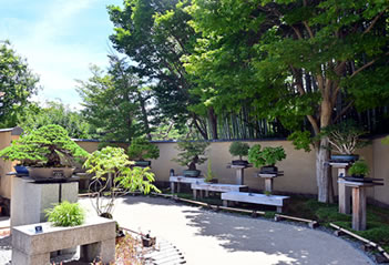 (左)盆栽苑入口。右に案内書「讃樹亭」がみえる (右)生きた芸術品と評される数々の盆栽が並ぶ