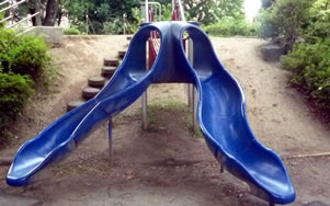 園内の南側には小山が設けられており、ここには小山の上から滑り降りる滑り台が設置されている。これはネット遊具と滑り台を組み合わせた複合遊具で、滑り口から2本の滑り台が伸びている。この日は、小さな子がお母さんに励まされながら滑り台に果敢に挑戦していた。