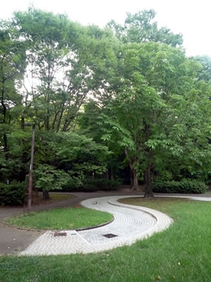 園内西側には高い木々が立ち並んでおり、その間に散策路が伸びている。このあたりは、かつての鎮守の森の雰囲気を残している一角だ。