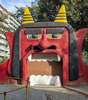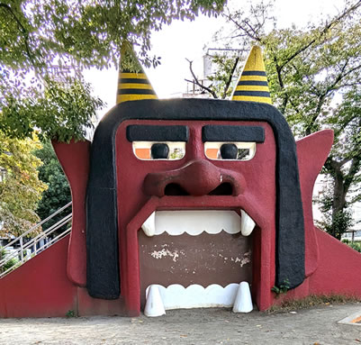 JR立川駅南口から左へ徒歩7分。「立川通り」がJRの線路をくぐる南西側に「錦第二公園」がある。大きなオニの面が東西に1枚づつ付いた滑り台(高さ約5メートル)が人気で、通称、オニ公園という。オニは髪と眉、目玉が黒く、顔は赤に彩色されている。大きな口を開け、今にも人を飲み込みそうだが、どことなく愛きょうがありかわいい。