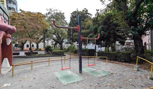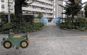 公園の囲りはマンションや予備校などのビルが並ぶ。昼休み、学校や仕事の帰りにほっと一息できる都会のオアシスになっている公園だ。水飲み場とトイレあり。