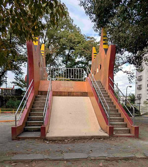 近づいてよく見ると、南側には左右に階段があり、上に登れるようになっていた。上に登ると北側に幅広の滑り台があった。南側には左右の階段の間が斜度の緩い(小さな子ども用)滑り台になっていた。ここの滑り台は、高低差の違う二本のスベリ台が合体しているのだ。