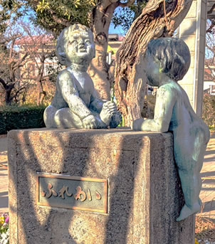 南武線西国立駅前から東に延びる路地を行くと、バスが通る羽衣いちょう通りに出る。左に進み羽衣中央を右へ。立川六小の東側にあるのが羽衣公園。入口の黄色、紫のパンジーが咲く花壇の中から「ふれあい」と題された裸の小さな子ども2人のかわいい彫刻が出迎えてくれた。すぐそばに設置された「羽衣公園・立川市」と書かれた五角形の看板もかわいい。