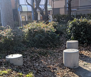 公園左側は小さな児童遊園と植物園が合わさったような造りになっている。花壇近くに白いスツール型のイスが3脚。どれも座面にも、わらべうたの歌詞と「振り」をイラストで紹介している。「かごめ かごめ」は子どもたちが手をつないで輪になって回っているイラスト。「げんこつやまのたぬきさん」は細かい手の振りを丁寧に。目尻に指をあてたイラストを「あがりめ・さがりめ」の歌詞につけてある。寒い今は枯れ葉に包まれて目立たないスツールだが、温かくなったら見てほしい。