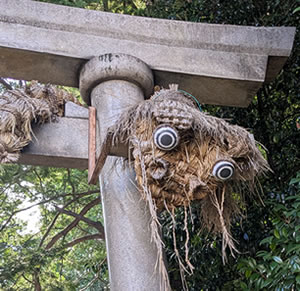 高い木に囲まれた入口の鳥居にワラで作られた大蛇が飾られている。近づいて大蛇の顔を下からよく見ると、大きな目がこちらをにらんでいるように見え迫力がある。