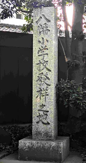 (右)八幡小学校発祥の地を示す石碑