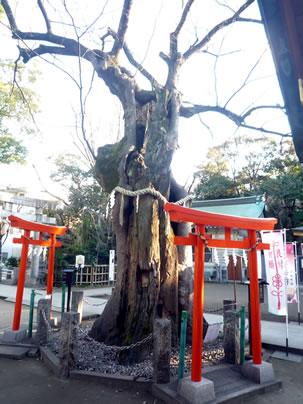おめでたい雰囲気に包まれながら境内に入ると、参道脇に御神木の大ケヤキが伸びていた。樹齢700年というこの大ケヤキは、江戸時代の落雷や戦災によって幹が大きく裂けてしまっているが、新緑の季節には青々と葉を茂らせるという。立派な御神木の脇には手水舎があり、こちらは可憐な切り花が浮かべられ華やかな雰囲気を演出。背後にはウメの花が描かれた提灯が掲げられていた。