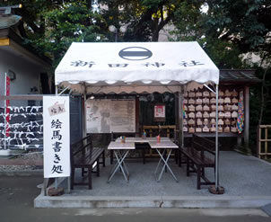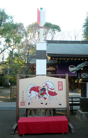 破魔矢のオブジェや石の卓球台は、町おこしの一環として行なわれた「多摩川アートラインプロジェクト」によるものだ。社殿右手には「LOVE」と刻まれた石の彫刻が設置された「LOVE神社」もあった。
