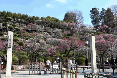 丘陵斜面を利用した庭園なので、下から上まで植栽されている紅白の梅を面として見ることができる。中でも枝垂れ梅は人気で、若者も車いすの高齢者もその前で順番に記念撮影。梅園のメイン通りは、銀座通り並の混みようだ。