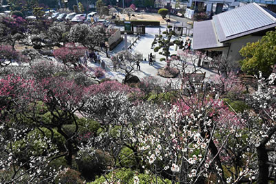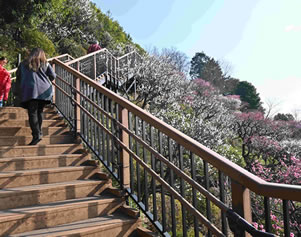 梅園の左右にある階段を上れば丘陵斜面の上部にある見晴台から梅園を見下ろせる。梅の香り漂う上からの梅園の景色も格別だ。
