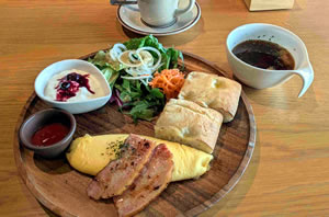 2階のレストランでモーニングを楽しむ。テラス席に出なくても隣接するメインアリーナを一望できるからすごい。